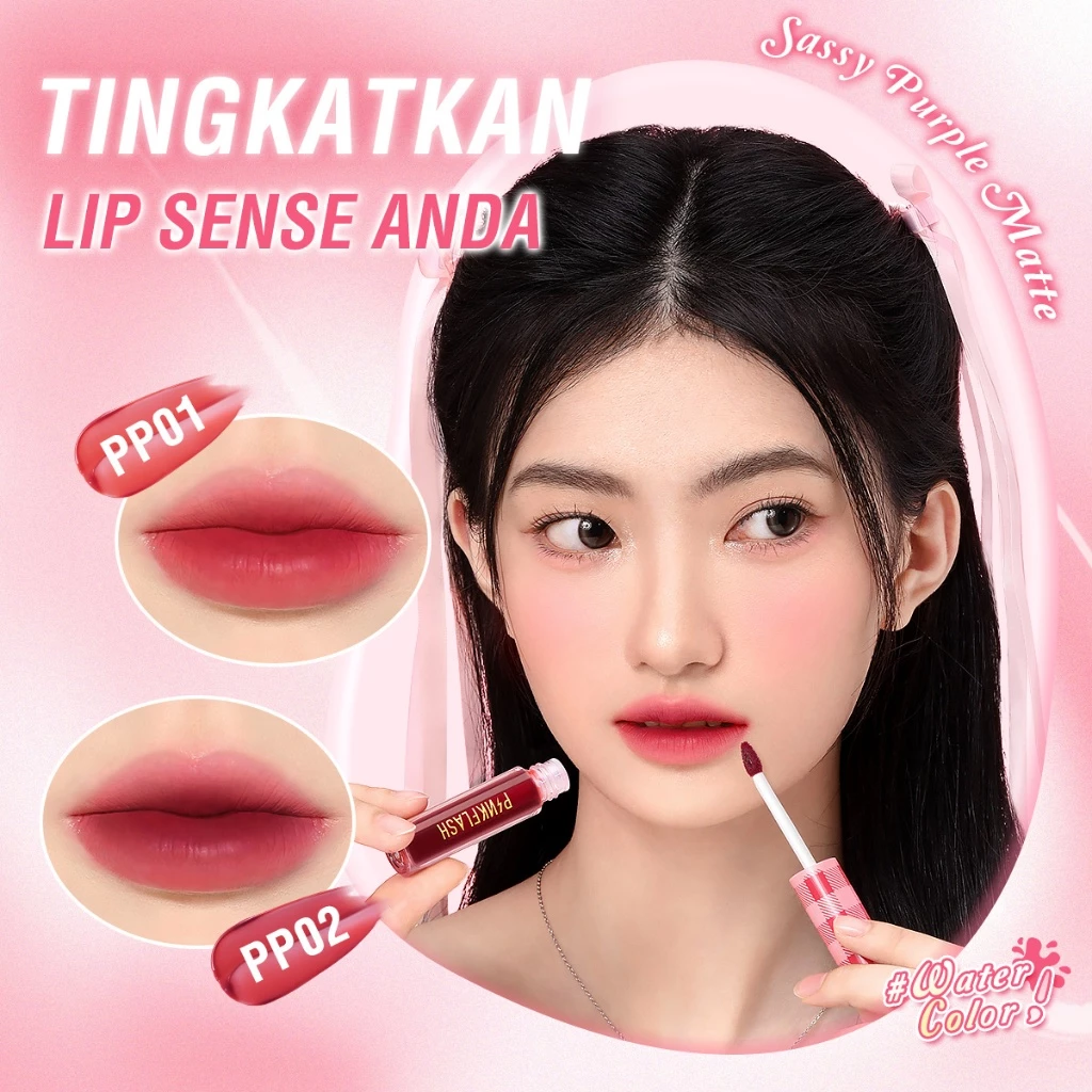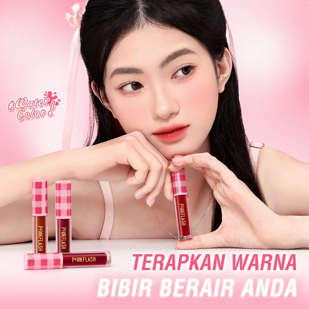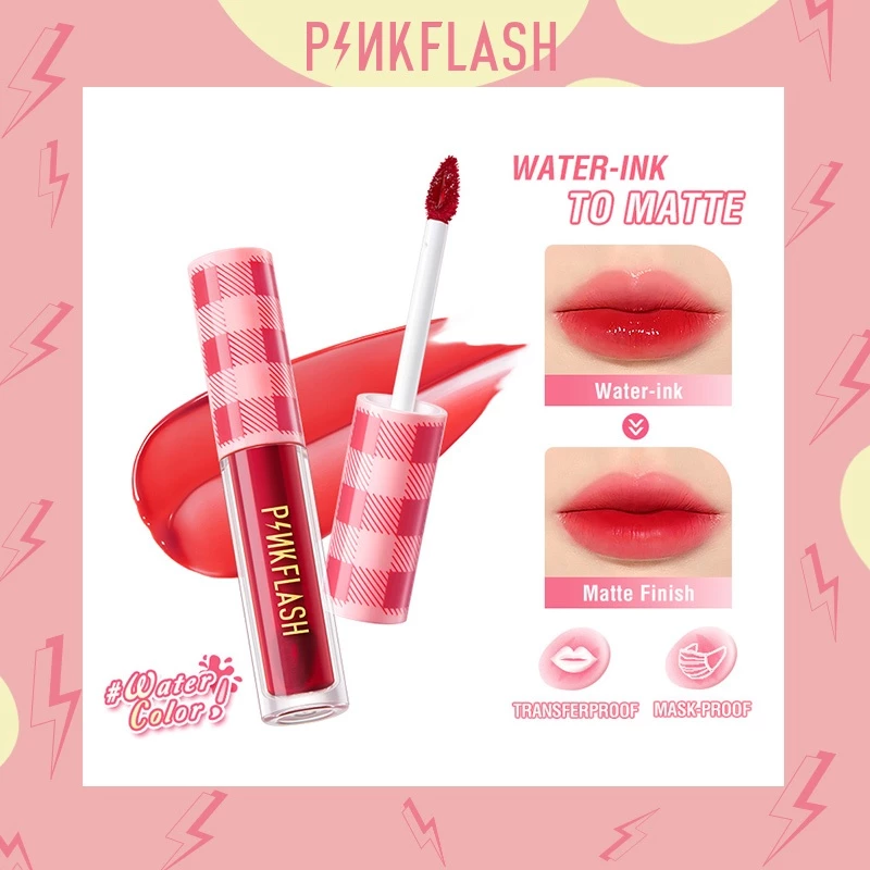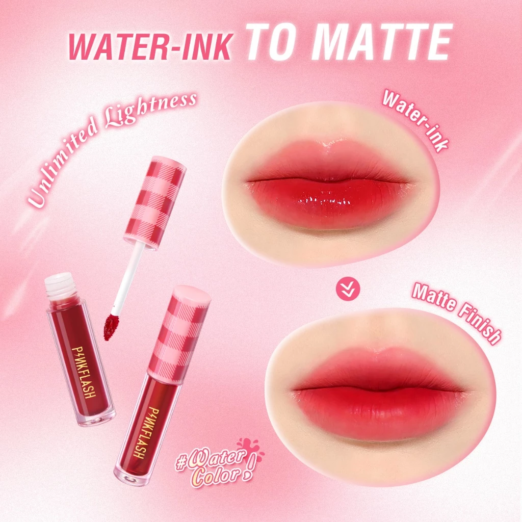 Unique new water-based formula! PINKFLASH#WaterColor Water Ink Airy Matte Lip Tint creates a vibrant water lips colors with a minimal transfer, water-ink to matte, getting a soft airy-like matte effect.